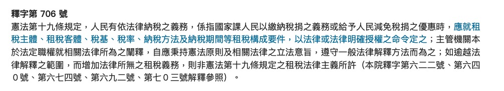 | 解釋文 | 1 憲法第十九條規定人民有依法律納稅之義務,係指人民僅依法律所定之納稅主體、稅目、稅率、納稅方法及納稅期間等項而負納稅之義務。至於課稅原因事實之有無及有關證據之證明力如何,乃屬事實認定問題,不屬於租稅法律主義之範圍。財政部中華民國七十二年二月二十四日(72)台財稅字第三一二二九號函示所屬財稅機關,對於設定抵押權為擔保之債權,並載明約定利息者,得依地政機關抵押權設定及塗銷登記資料,核計債權人之利息所得,課徵所得稅,當事人如主張其未收取利息者,應就其事實負舉證責任等語,係對於稽徵機關本身就課稅原因事實之認定方法所為之指示,既非不許當事人提出反證,法院於審判案件時,仍應斟酌全辯論意旨及調查證據之結果,判斷事實之真偽,並不受其拘束。尚難謂已侵害人民權利,自不牴觸憲法第十五條第十九條之規定。 |