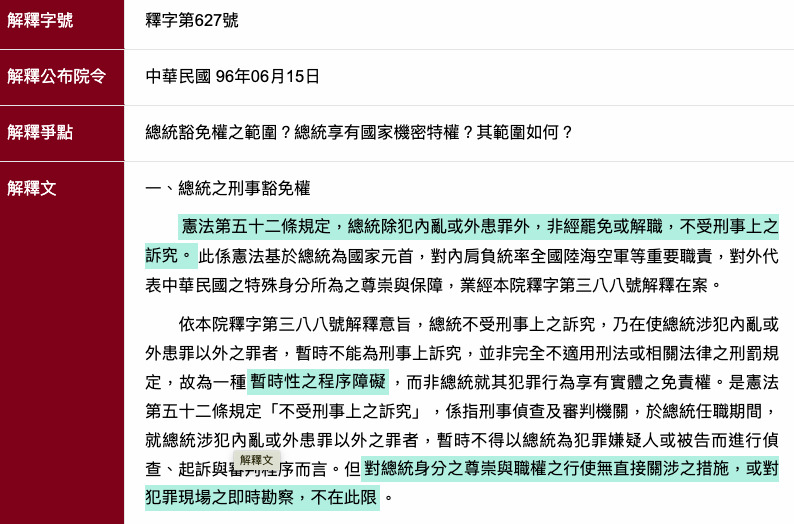 [解釋爭點]總統豁免權之範圍?總統享有國家機密特權?其範圍如何?