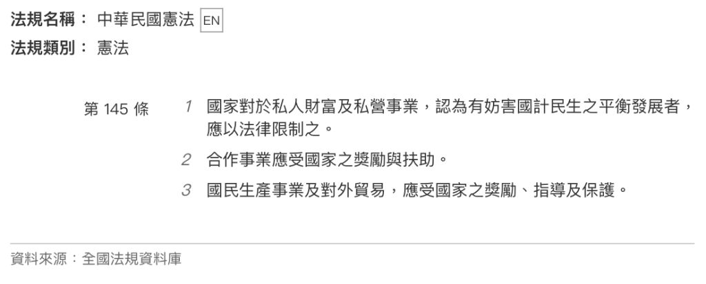 | 第 145 條 | 國家對於私人財富及私營事業,認為有妨害國計民生之平衡發展者,應以法律限制之。 合作事業應受國家之獎勵與扶助。 國民生產事業及對外貿易,應受國家之獎勵、指導及保護。 |
