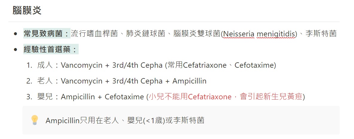 Ampicillin + Cefotaxime ( 或 Ampicillin + Aminoglycoside ) |