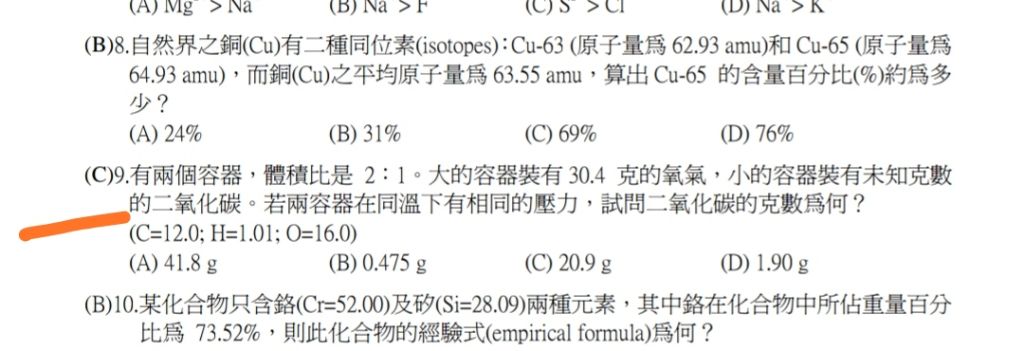 9.有兩個容器,體積比是 2:1。大的容器裝有 30.4 克的氧氣,小的容器裝有未知克數的二氧化碳。若兩容器在同溫下有相同的壓力,試問二氧化碳的克數為何? (C=12.0; H=1.01; O=16.0)
