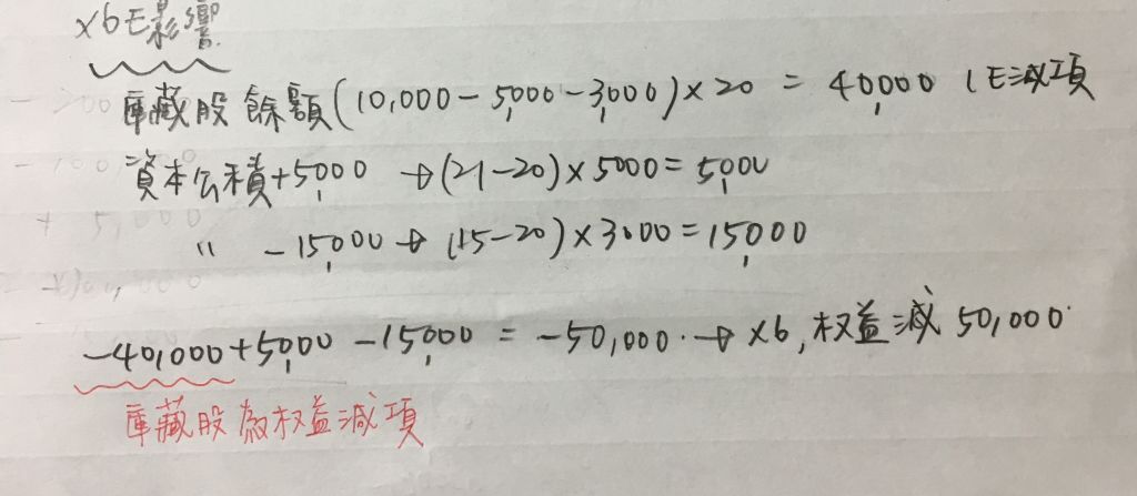 問題: 該公司 X6 年庫藏股交易事項,對 X6 年權益影響為何?