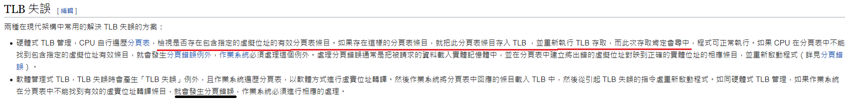 分頁表存主記憶體: 內文切換速度快 (僅交換分頁表基底暫存器值即可),適於大型分頁表,但位址轉換速度慢,可以 TLB (分頁表專用的快取) 技術解決。