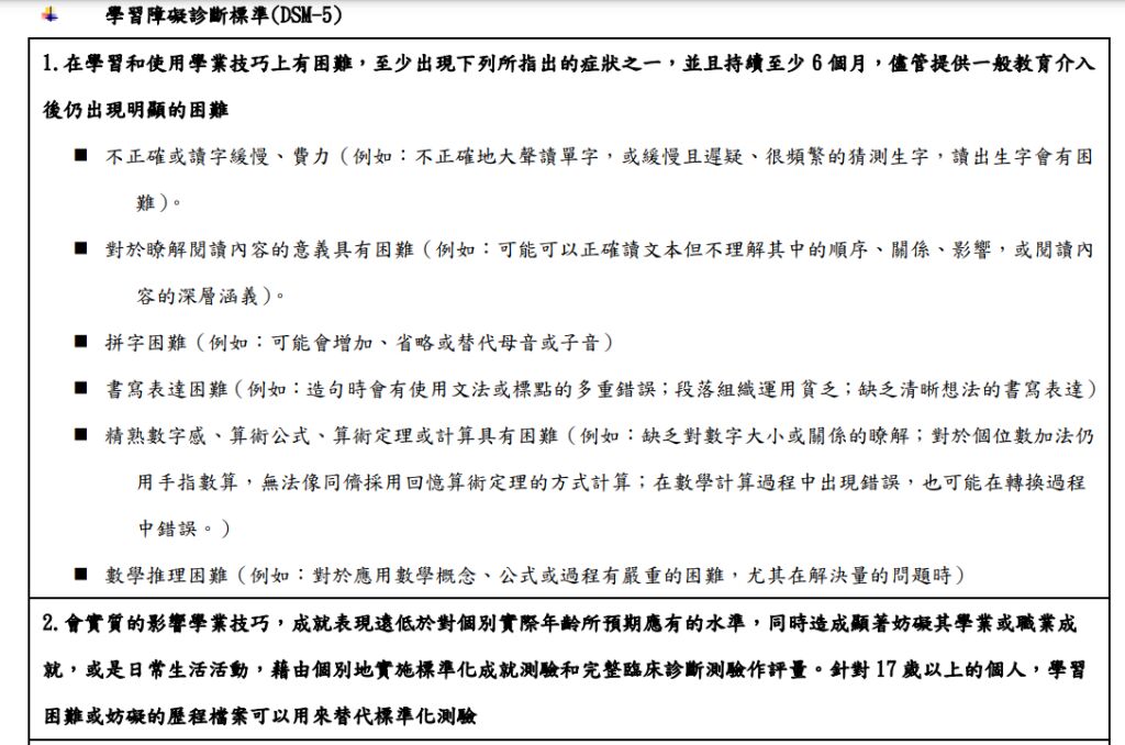 甲、在學習計算數字上有困難 乙、在數學解題能力上面臨相當大的困難 丙、雖能識字但閱讀依然緩慢而相當費力 丁、在學習英文時無法呈現學習字母與發音的一致性