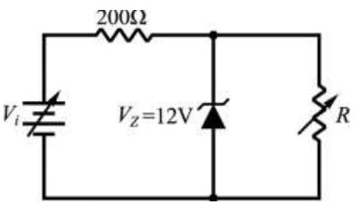 9. 如圖所示之穩壓電路,若稽納二極體(Zener Diode)的崩潰電壓為 12V,輸入電壓的範圍為 16V ≦ Vi ≦ 24V,負載電阻的範圍為 600Ω ≦R ≦ 1200Ω。若要維持穩壓功能,則此稽納二極體所消耗之最大功率為何?