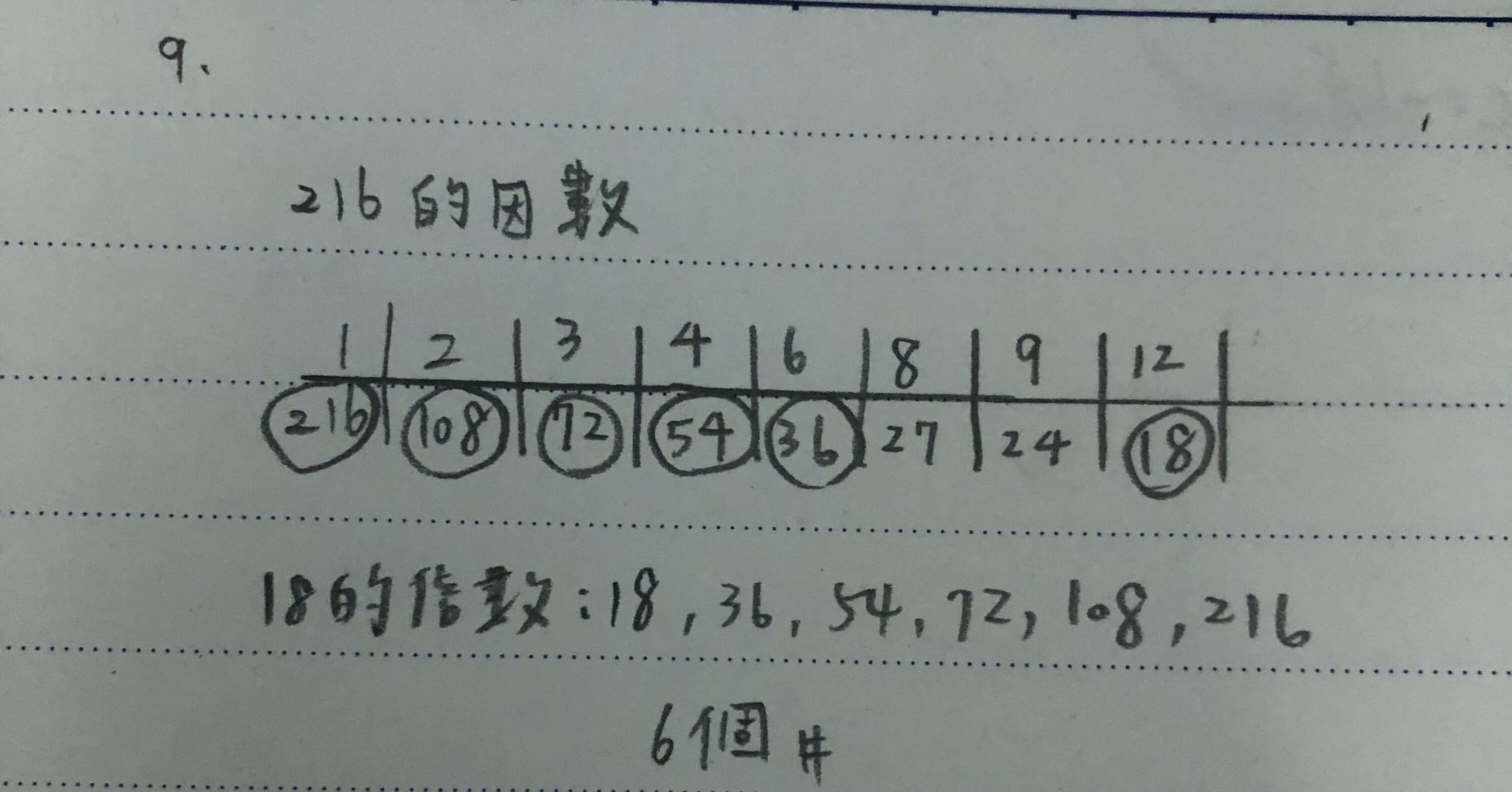 9. 有多少個正整數是 18 的倍數,同時也是 216 的因數?