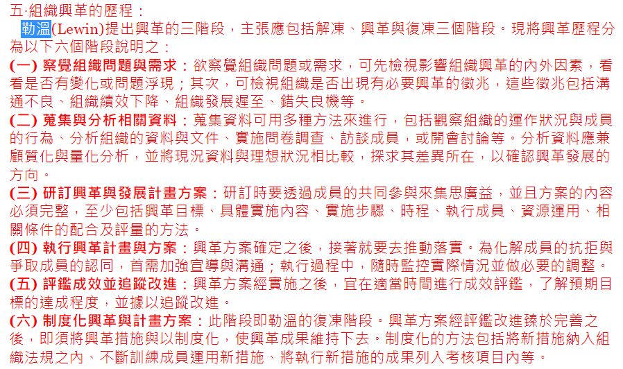 9. 組織興革有六個步驟:(1)察覺組織問題或需求、(2)蒐集分析相關資料、(3)研訂興革與