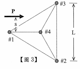 六、【圖3】鉚釘#1~#4承載作用力P = 9,0001bs,鉚釘#1、 #2反#3構成邊長L = 3.464 inch (= 2√3 inch)的正三角形, 而鉚釘斜位置在其中心點,作用力P與鉚釘#1及#4連線 的平行距離s = 1.5 inch,鉚釘剪力以“bolt-group”方法的計 算公式如下: