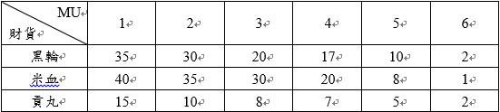 6. 小星對黑輪、米血和貢丸的邊際效用表如下,當黑輪每支10元,米血每支20元,貢丸每個5元。試回答下列問題: