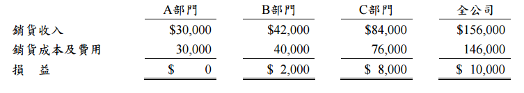各部門變動成本及費用占各該部門銷貨收入之百分比如下:A 部門 40%,B 部門 50%,C 部門 60%。 各部門共同性之固定成本及費用為$12,000,依直接人工小時分攤至各部門之數額如下: A 部門$3,000,B 部門$4,000,C 部門$5,000。 其他成本及費用,均屬各該部門之直接成本。 試作: