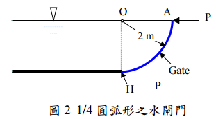 四、長 5 公尺形狀為四分之一圓弧形(圓半徑為 2 公尺)之閘門被鉸鏈(hinge) 栓住在 H 點如圖 2,內部水為靜止狀態,求: