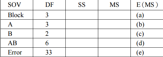 四、設有 A×B 二因子逢機完全區集設計(RCBD),區集為固定型有 4 區集,A 為逢機 型有 4 變級,B 為逢機型有 3 變級,變方分析表(ANOVA table)如下:(E(MS)代 表均方期望值)