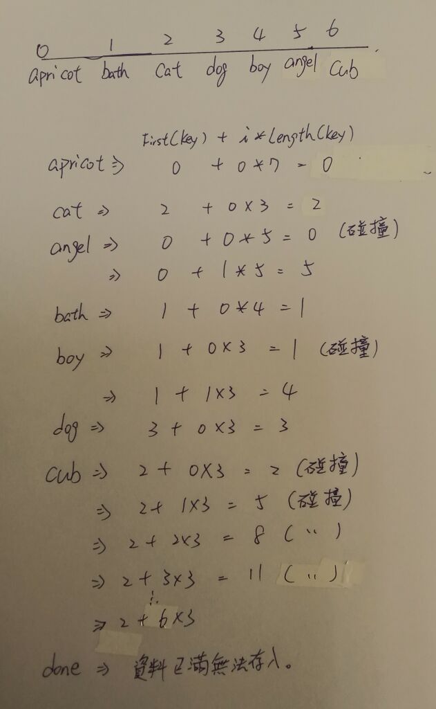 ⑴請將 apricot, cat, angel, bath, boy, dog, cub, done 依序儲存進該雜湊表。(15 分)