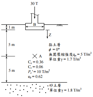 四、如圖所示,已知ㄧ方形基腳,承受 30 T之總荷重,若建造於φ = 0°,無圍壓縮強度q