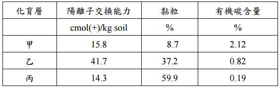 一、下表為甲、乙、丙三個不同土壤化育層的基本分析資料,資料包括陽離子交換能力 (CEC)、黏粒及有機碳含量,請回答下列問題,並說明理由。