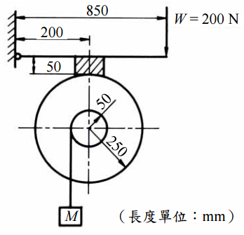 四、如圖所示,一單式短塊剎車設計用來阻止重量為 M 之物體自由落下,若該接觸面之 摩擦係數為 0.2,作用力W = 200 N 時,試問此剎車設計在此作用力下:
