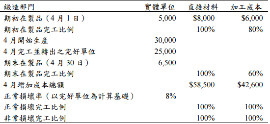 試作:利用分步成本制度計算下列方法下之鍛造部門 4 月份完工並轉出的成本(包 含正常損壞)、非常損壞成本、期末在製品成本。