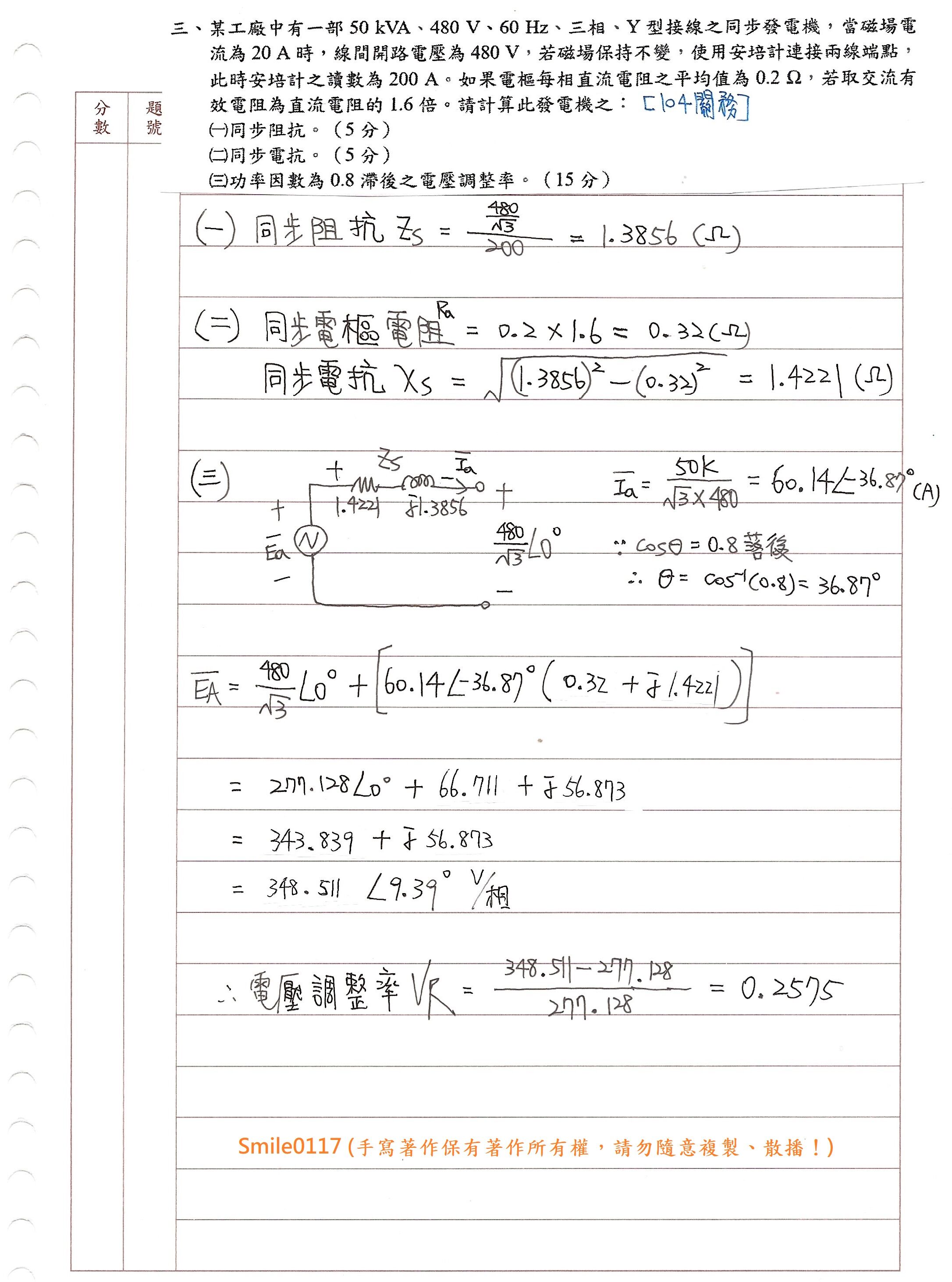 三、某工廠中有一部 50 kVA、480 V、60 Hz、三相、Y 型接線之同步發電機,當磁場電 流為 20 A 時,線間開路電壓為 480 V,若磁場保持不變,使用安培計連接兩線端點, 此時安培計之讀數為 200 A。如果電樞每相直流電阻之平均值為 0.2 Ω,若取交流有 效電阻為直流電阻的 1.6 倍。請計算此發電機之: