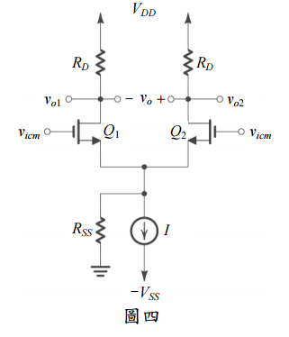 四、如圖四所示之一MOS差動對(differential pair)電路工作在 1 mA之偏壓電流,電晶體