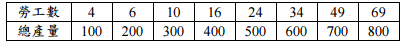 二、下表為某廠商僱用勞工數與總產量資料。已知該廠商於完全競爭市場出售商品, 價格 20 元,並且該廠也在完全競爭的勞動市場僱用勞工。
