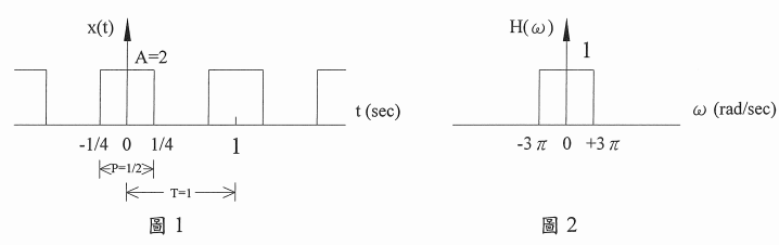一、有一線性非時變系統,頻率轉移函數為H(w),已知其輸入為一週期訊號x(t),週期T=1 秒、振幅A=2、脈波寬P =1/2 ;輸出訊號y(t),x(t)及H(w)如圖1、2所示: