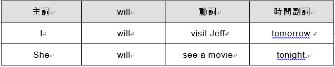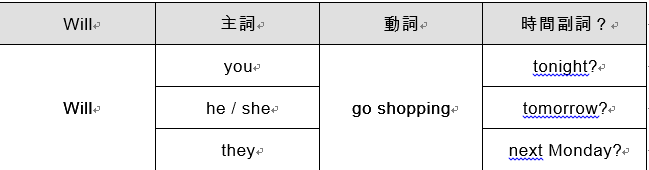Will you go shopping tonight? A. 未來簡單式的使用(肯定句) B. 未來簡單式的使用(疑問句) 若要改為否定疑問,則是將Will not縮寫成Won΄t為首的句子。 C. 回答上述問題 Ex: 請依據範例,利用提示字造疑問句: 範例:Abby / visit her grandparents / this afternoon Will Abby visit her grandparents this afternoon?