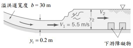 二、如下圖,溢洪道常以適當的發生水躍(hydraulic jump)現象來防止趾部沖刷,若水躍的上游水深 y1 = 0.2 m 、速度 V1=5.5 m/s ,溢洪道寬度 b = 30 m 。