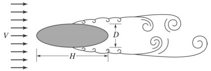 五、如下圖,流體流經橢圓形斷面結構物後發生週期性渦漩分離(vortex shedding)現象,該渦漩分離頻率(shedding frequency)ω與斷面尺度 D、 H 及流速 V、流體密度ρ、黏滯度(viscosity)μ相關。