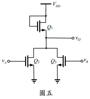 五、有一個 NMOS 邏輯電路如圖五所示,其中電晶體 Q1 、Q2 與 Q3 的臨界電壓 (Threshold Voltage) 分別為= 1 V,(W /L) 2 = (W /L)3 = 4(W /L )1, = 5 V ,忽略通道長度調變(Channel Length Modulation)與基底效應 (Body Effect)。請計算:
