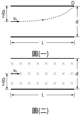 (1)試問電子的初速 v0 至少必須大於何值,電子才能避開電極板,逸出電容器外?(以 e,m,L,d 及 V 表示)