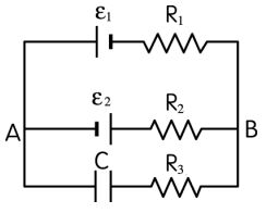 13. 如圖所示的電路,ε1=4.0 V,ε2=6.0 V,R1=3.5 Ω,R2=1.5 Ω,R3=4.0 Ω,C=2.0 pF(1 pF =1×10-12 F)。電池的內電阻可以忽略,平行板電容器 C 的板距為 2.0 mm。充電完畢後,求: