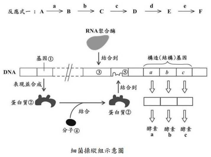 2. 分子 F是 細菌生長必須的養分,缺乏 F分 子時,細菌無法 正常生長。細菌從環境中吸收A分子後,利用a、b、c、d 及 e五 種酵素催化一連串的代謝反應(反應式一)。五種酵素中的三種酵素基因 a 、 b 、 c 位於相同的操縱組(下圖),此操縱組受到細菌體 內 F分 子濃度的回饋抑制。