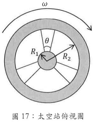 十九、 太空站的結構俯視圖·如圖17所示,內外環之間有三個連接的管道。管道是介於內圓環 (R1)和外圓環(R2)之間,即管道是在R1<R< R2之間,共中R是管道中某點和太空站中心的距離。管道的長度為R2-R1,截面為長方形,高度為h。在R處的弧線長度為Rθ,θ為連接管道左右兩壁與中心軸所形成的夾角。若太空站內空氣溫度恆為定值T,空氣可视為由單一種分子組成的理想氣體,每個分子質量為m。已知太空站繞中心軸以角速率ω自轉,空氣被帶動一起轉動並達到平衡。若在管道R處的空氣壓力為P,在R+AR處的壓力為P+△P,已知