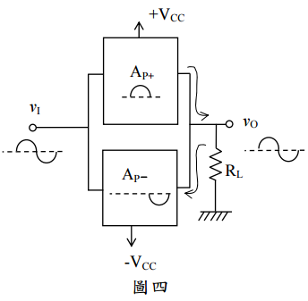 分別為理想正半週與負半週信號放大電 路,假設無交叉失真(crossover distortion),當 vI =0 時,v