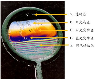 四、肥皂水薄膜上色彩繽紛的光學現象探究:下圖顯示一肥皂水薄膜形成於 傾斜或垂直擺放的中空環中,當其受到白光垂直照射時,可觀察到表面 出現一系列由上至下排列的繽紛色帶。這些色帶在顏色與寬度上皆有所變化,圖中以 A、B、C、D 與 E 標示出五個具有代表性的區域,供以下 問題作答參考。