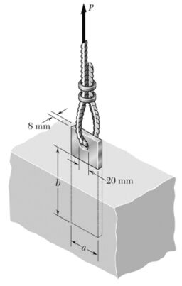 二、有一厚度為 8 mm 之鋼板嵌入水平混凝土板中,如圖所示,用以固定一高強度垂直纜線。已知鋼板孔徑為 20 mm,鋼材之極限強度為 250 MPa,鋼板與混凝土間之極限黏結應力為 2 MPa。當作用力 P = 10 kN,且安全係數要求為 3.60,求: