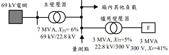 三、有一煉鋼廠之電弧爐由電網以 69 kV 供電,如下圖所示。已知電源側短路容量為 1500 MVA,電弧爐之總電抗為 41%,主變壓器與爐用變壓器之規格如圖所標示。為顧及廠內用電之電力品質,量測點位於主變壓器低壓側匯流排,若選擇基準容量=3 MVA,試回答下列問題: