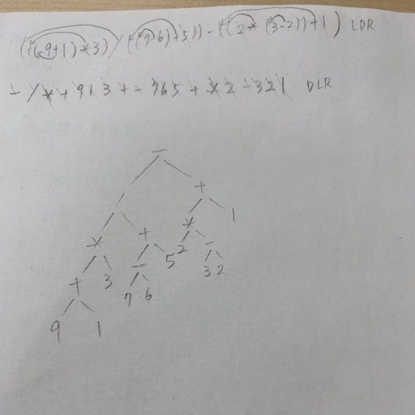 (一) 請繪出此算術運算式之二元樹,其終端節點均為運算元(1、2、3、5、..),非終端節點 均為運算子(+、-、*、/)。(5分)