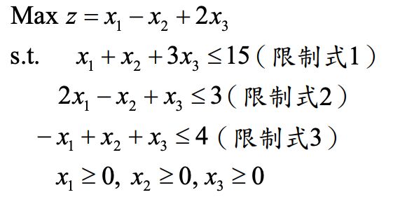 三、考慮下列線性規劃問題:令 x4 , x5 , x6 分別代表限制式 1, 2, 3 的寬裕變數(Slack Variable),考慮一 個基本解(Basic Solution) X B =( x1 , x3 , x2 ),此基本解所對應的反矩陣 (Inverse)為