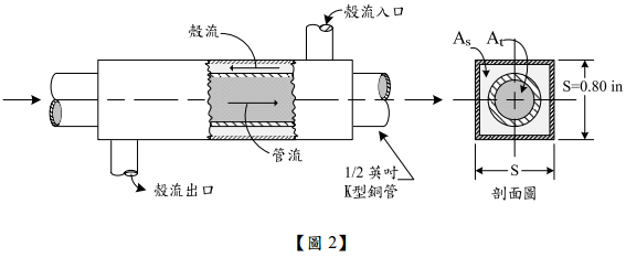 五、【圖 2】為一熱交換器,係由一正方形殼圍繞一圓管所組成,其熱交換是利用內圓管內側 流體 (管流) 流動,和正方形殼內側與內圓管外側間之流體 (殼流) 流動。若已知管內流體 (管流)及殼中流體(殼流)兩者流動速度皆為 2.4 m/s,1/2 英吋 K 型銅管外直徑為 15.88 mm 、內直徑為 13.39 mm、管壁厚為 1.245 mm,S = 0.80 in,π = 3.14,試求:(計算至小數點 後第 1 位,以下四捨五入)(各小題 5 分,共 15 分)