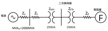 二、一鋼鐵廠如下圖所示啟用一座 50 噸煉鋼用電弧爐,主變壓器及爐用變壓器 之裝置容量皆為 25 MVA,其等效電抗分別為=j0.06 與 =j0.05 pu, 電弧爐及其配線之等效阻抗為 =j0.4 pu。台電經由一次變電所單獨供應 69 kV 電力,一次變電所至鋼鐵廠的線路阻抗為=j0.01 pu,上述線路與變壓器之電阻 R 忽略不計,系統短路容量為 2000 MVA,以主 變壓器 25 MVA 為基準值。試求