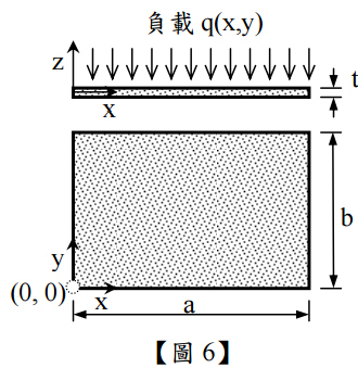 六、【圖 6】為矩形板承受負載 q(x,y)與幾何尺寸關係圖,矩形板邊長分別為 a = 450 mm、b =