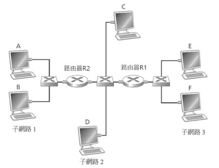三、考量以下網路架構,並假設子網路之間使用的是可提供實體至網路層服 務的路由器 R1 與 R2 進行資料交換。