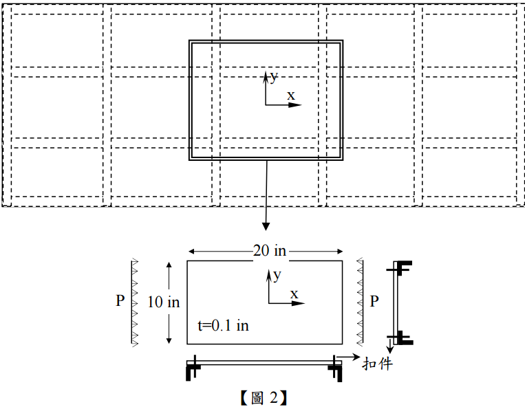 三、【圖 2】為大平板以單排扣件與數根 L 型加強條搭接,取出加強條間的小平板進行挫曲 (Buckle)分析,假設小平板只承受 x 方向壓力 P,請回答下列問題: