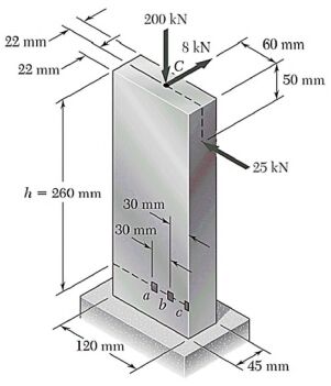 一、桿件一端固定於地,上方受到三個力的作用,如圖所示,求: