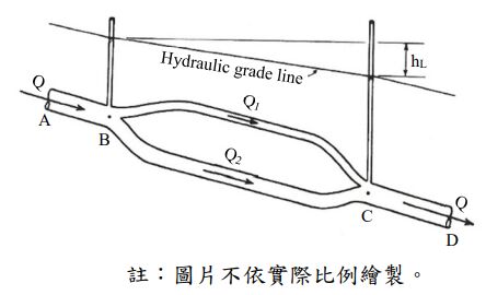 三、有一流量 Q 水流流經平行雙管系如下圖所示,若 AB 管長 150 m,管徑 0.6 m,BC 沿 1 號路徑管長 1200 m,管徑 0.45 m,沿 2 號路徑管長 1500 m ,管徑 0.3 m,且 CD 管長 300 m,管徑 0.45 m。假設沿管路產生之摩擦損失條件均相同,忽略所有次要損失,以曼寧公式計算水頭損失, 曼寧糙度係數 n= 0.013,試求