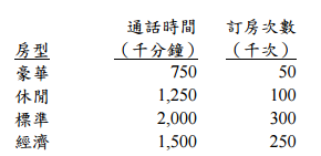 三、甲度假村擁有一訂位部門接受訂位,訂位服務成本是以訂位電話通話時間分攤給豪 華、休閒、標準與經濟四種房型,其他成本則以每種房型之訂房次數分攤。甲度假 村近來想以更精確的方式,來分攤其訂位服務成本,以增加競爭力。與訂位服務相 關資料如下: