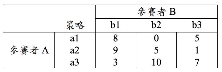 一、考慮一個雙人零和賽局(Two-person Zero-sum Game) ,其收益表(Payoff Table)如下: 若參賽者 A 採取策略 a1,而參賽者 B 採取策略 b1,參賽者 A 之收益為 8, 相對地,參賽者 B 之收益為−8,餘此類推。