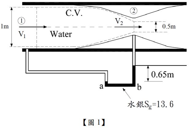 五、如【圖 1】所示為一量測流量之工具,在理想狀況下無能量損失,U 型管中水銀之液面高 差為 0.65 m,水銀比重 13.6,斷面①與斷面②的直徑分別為 1 m 及 0.5 m,請回答下列 問題(計算至小數點後第 2 位,以下四捨五入):(3 題,每題 5 分,共 15 分)