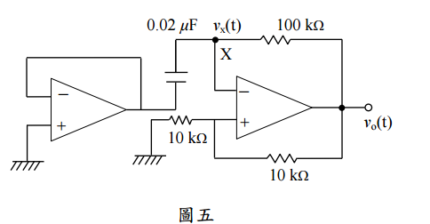 為週期性振盪之方波,OP 為理想運算放大器,其最大飽和電壓為 ± 15 V。